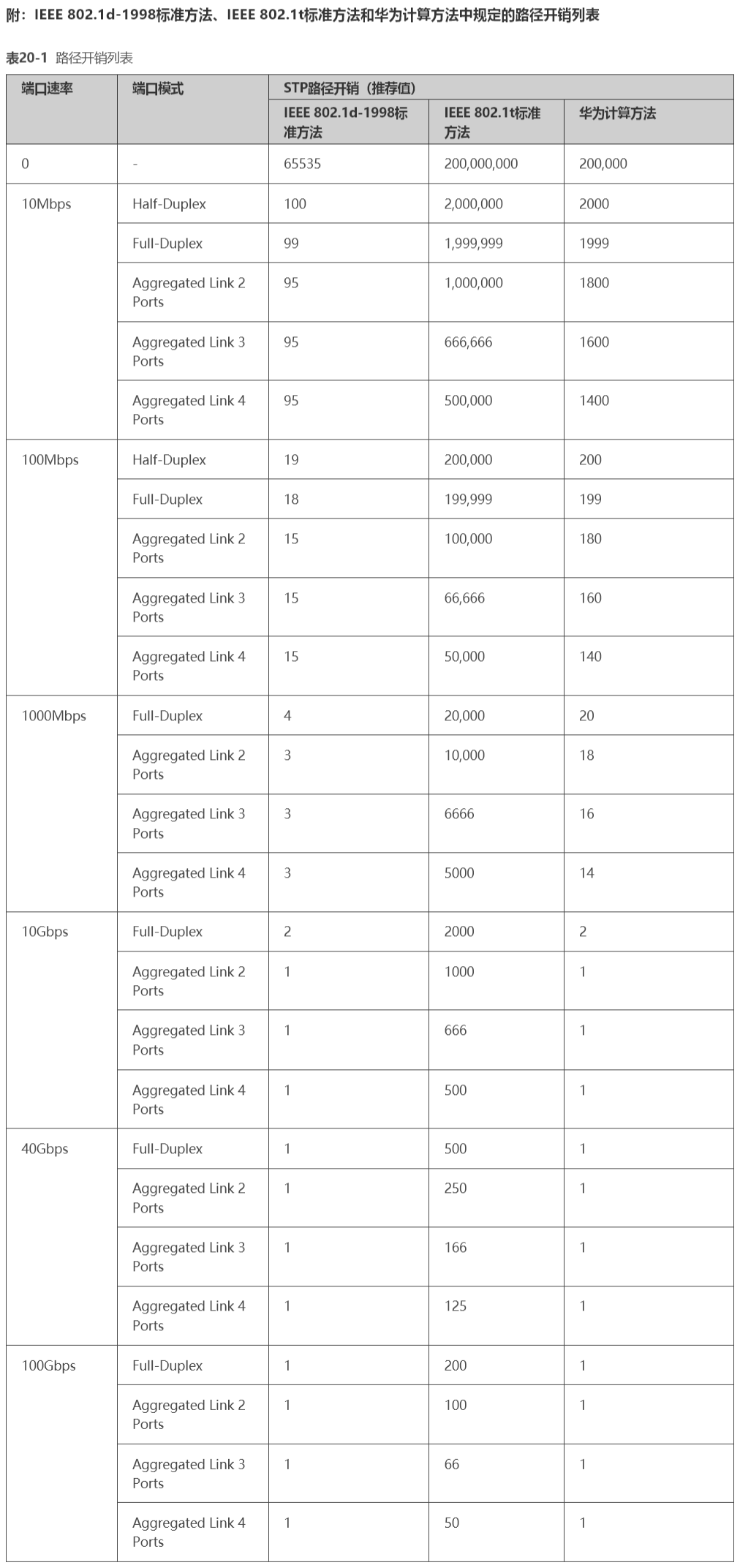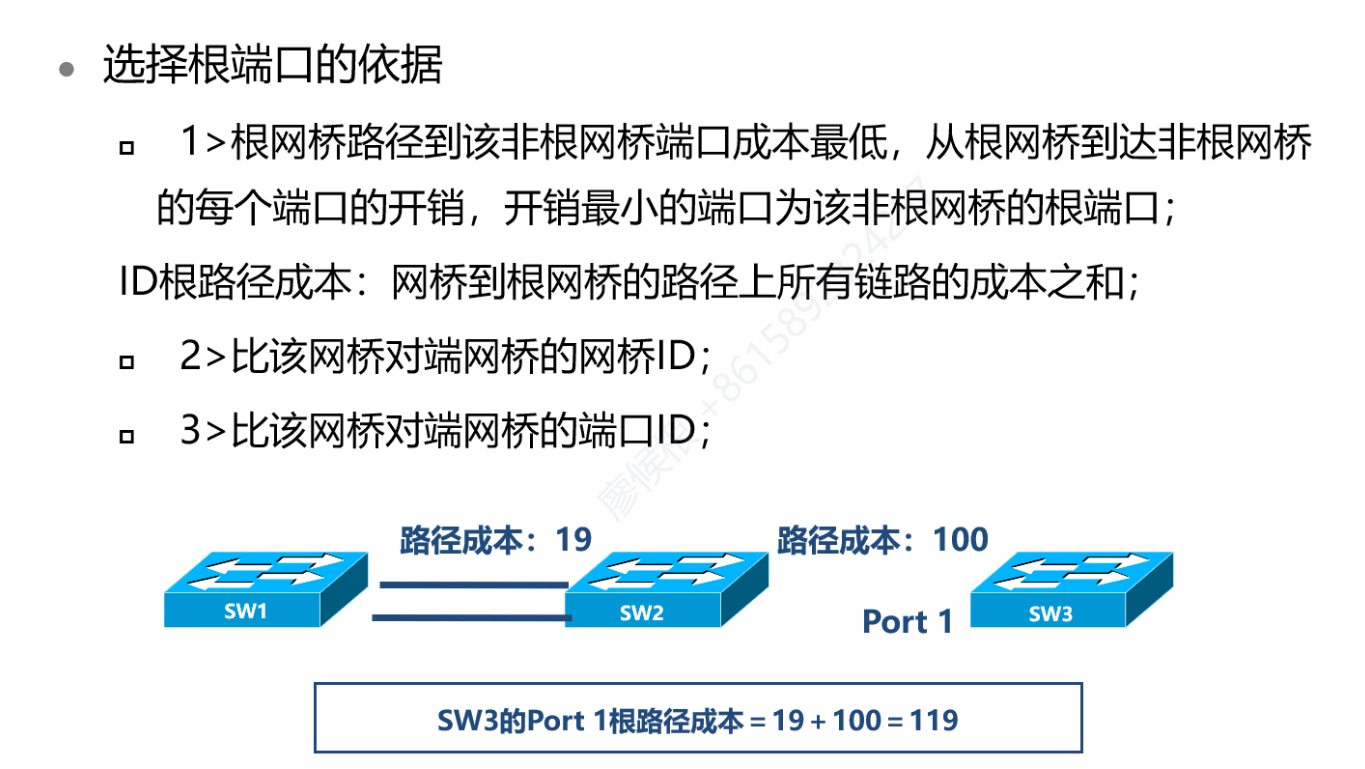 到根路径成本最低的端口:路径成本是两个网桥间的路径上所有链路的成本之和,根路径成本也就是一个网桥到达根网桥的中间所有链路的路径成本之和,路径成本用来代表一条链路带宽的大小,一条链路的带宽越大,它的传输数据的成本也就越低。(10Mb/s=100,100Mb/s=19,1000Mb/s=4,10000Mb/s=2成本)