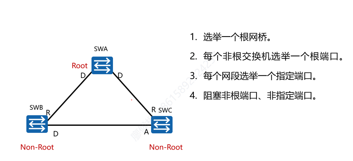 选出了根网桥之后,网络中的每台交换机必须和根网桥建立关联,因此STP将开始选择根端口。每个非根网桥上存在一个根端口,因此需要在每个非根网桥上选择一个根端口。选择根端口的依据有三个: