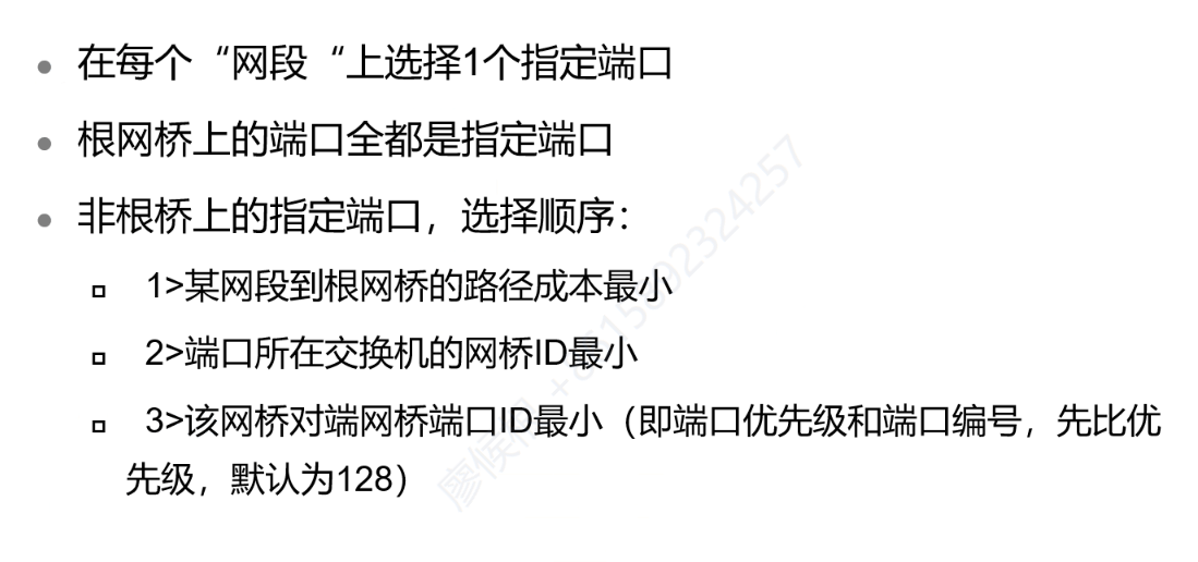为了消除环路形成的可能,STP进行最后的计算,在每一个网段上选择一个指定端口