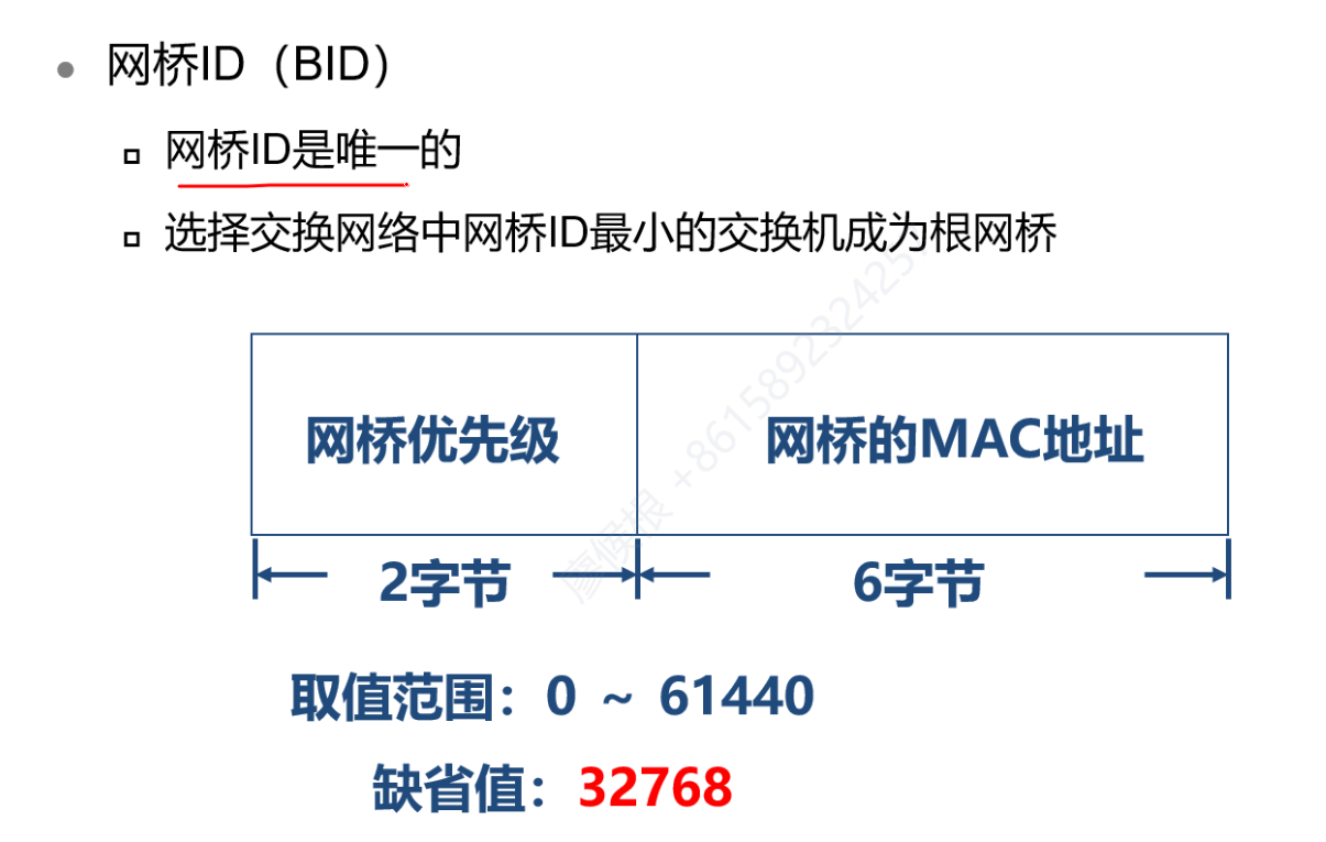 网桥ID:是一个8Byte的字段,前面2Byte的十进制数称为网桥优先级,后6Byte是网桥的MAC地址。
