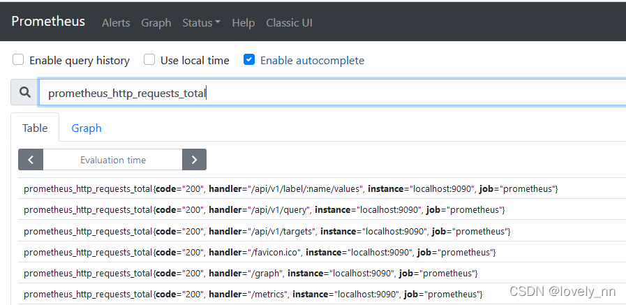 在Graph 菜单下面可以查看抓取的一些监控数据,例如输入指标prometheus_http_requests_total