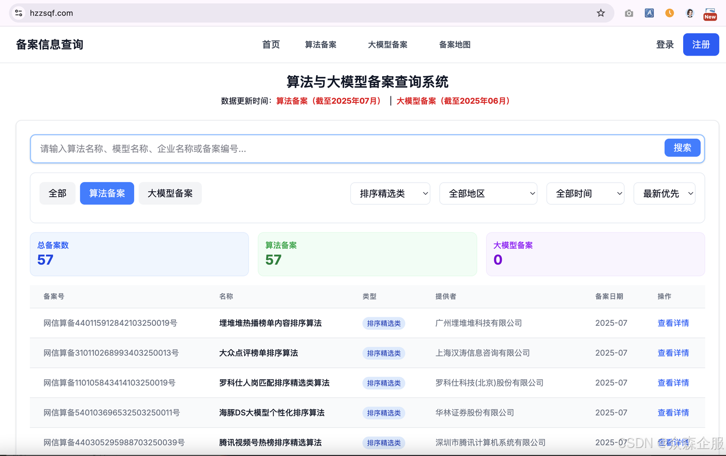 然而,随着《互联网信息服务算法推荐管理规定》的深入实施,对这类具有广泛影响力的算法进行合规备案已成为企业的必要责任。截至2025年7月份,全国总共有57个排序精选类算法备案通过,本文将结合备案系统的实际界面,为您提供一份详细、易懂的“排序精选类算法备案”操作指南,助您一步步完成备案,确保业务在合规轨道上稳健运行。