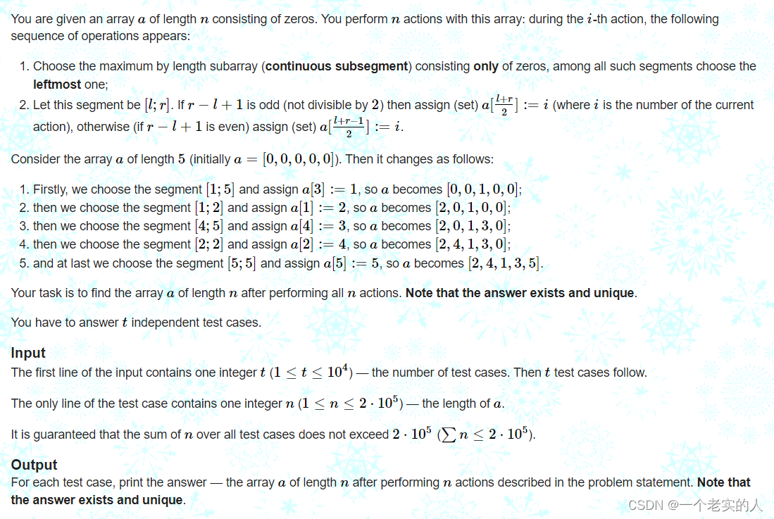 思路:每次考虑最长的,如果等长先考虑左边的,不妨设一个struct存一下每个区间的左右端点排个序,顺序问题则解决了。之后用priority_queue每次找顺序最靠前的,如果最中间没填过就填最中间的,注意一个区间分叉再入队列至少其分叉前长度>=2,否则区间长度为1分叉会出错。【思路很简单,主要练一下pq怎么用以及重载】