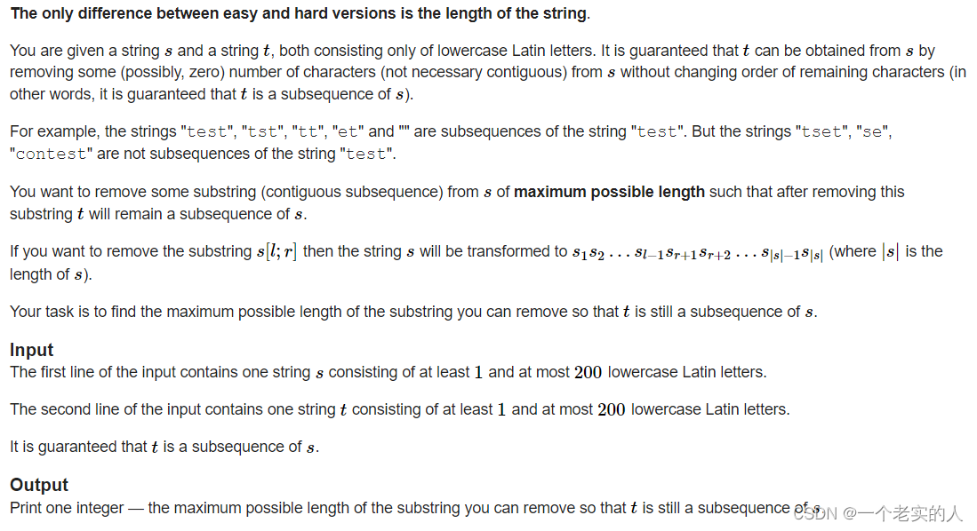 题意:一个长串n一个短串m,短串所有字符一定能与长串中某些字符相同,找出匹配条件下删除最长片段的长度。