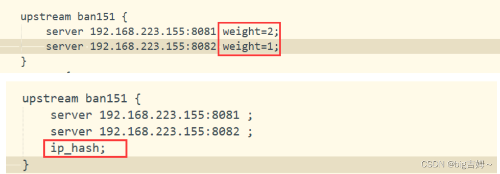 指定轮询几率,weight和访问比率成正比,用于后端服务器性能不均的情况。