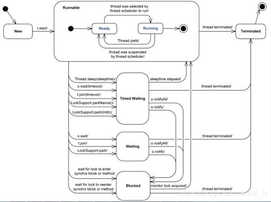 RUNNABLE:在jvm中执行,也不一定执行,需要等待cpu的分配时间片,得到cpu,进入Running状态,当让出cpu(thread.yield)时,进入reday状态,再获得cpu时,就是running状态