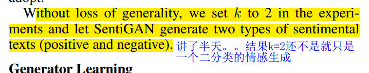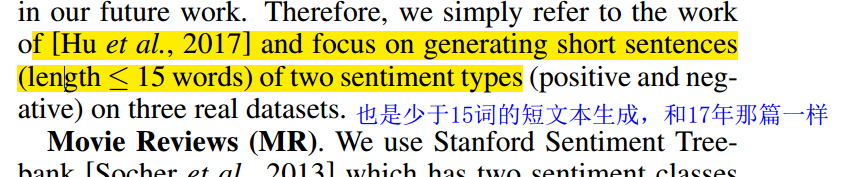 这篇文章主要是写了一个用多分类器和多个生成器生成带情感的文本的gan模型,结果最后的实验不是生成器的个数还是设为2,相当于并没有比之前的工作多了类型,另外和17年那篇icml的文章一样,这篇也是令训练数据文本小于15个单词,也是短文本生成,回头我在看看它的代码咋写的。