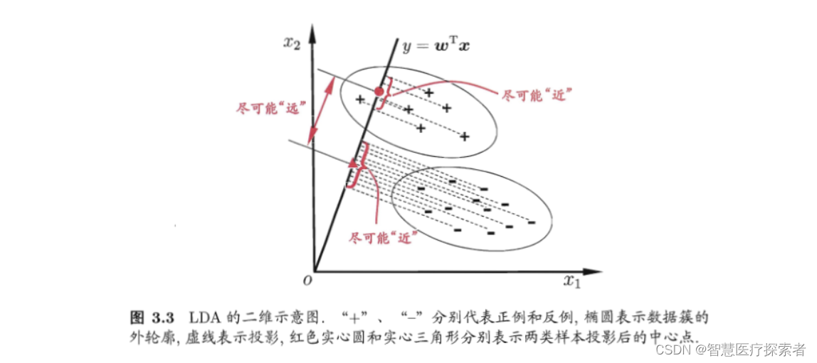 LDA的原理:投影到维度更低的空间中,使得投影后的点,会形成按类别区分,一簇一簇的情况,相同类别的点,将会在投影后的空间中更接近方法。下图来自周志华《机器学习》,给出了一个二维示意图: