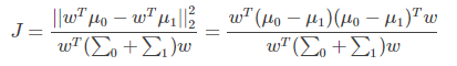 其实这里的 x 就是样本向量(列向量),如果投影到一条直线上 w 就是一个特征向量(列向量形式)或者多个特征向量构成的矩阵。至于 w 为什么是特征向量,后面我们就能推导出来。 y 为投影后的样本点(列向量)。我们首先使用两类样本来说明,然后再推广到多类问题。