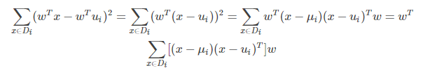 上式的中间部分(即第二行的式子)就是同类样本投影前的协方差矩阵。还可以看出同类样本投影前后协方差矩阵之间的关系。如果投影前的协方差矩阵为 则投影后的为