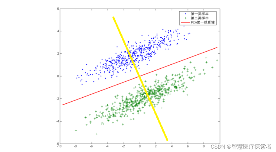 针对这个数据集,如果同样选择使用PCA,选择方差最大的方向作为投影方向,来对数据进行降维。那么PCA选出的最佳投影方向,将是图中红色直线所示的方向。这样做投影确实方差最大,但是是不是有其他问题。聪明的你发现了,这样做投影之后两类数据样本将混合在一起,将不再线性可分,甚至是不可分的。这对我们来说简直是地狱,本来线性可分的样本被我们亲手变得不再可分。而我们发现,如果使用图中黄色直线,向这条直线做投影即能使数据降维,同时还能保证两类数据仍然是线性可分的。上面的这个数据集如果使用LDA降维,找出的投影方向就是黄色直线所在的方向。