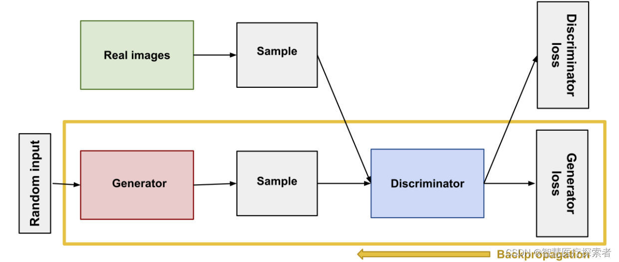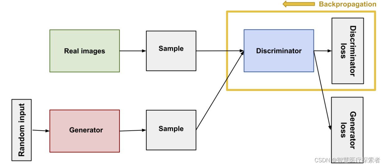 - 判别器通过对来自于判别器网损失函数计算的损失进行反向传播。如上图。