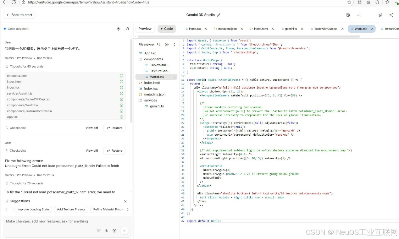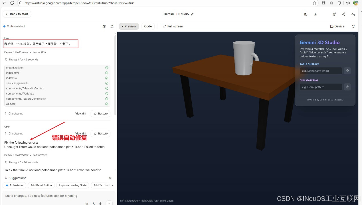 我们使用开发平台,输入提示词:我想做一个3D模型,展示桌子上面放着一个杯子。如下图: