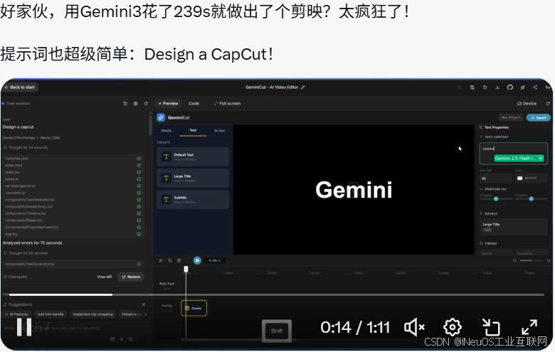 在X平台上也有很多各种测试,例如有利用Gemini3开发类似剪映的,如下图: