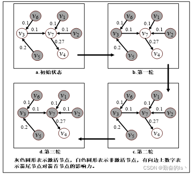 线性阈值模型(Linear Threshold Model,LT模型)可以用来模拟影响力的传播过程。在LT模型中,节点只能处于激活状态或者非激活状态。激活状态的节点通过有向边试图激活处于非激活状态的邻居节点。而对于非激活状态的节点,当所有激活状态的邻居节点对其影响力之和大于该节点的激活阈值时,该非激活节点就转为激活状态。当网络中不会再有节点被激活时即由非激活状态转为激活状态时,影响力的传播过程收敛。