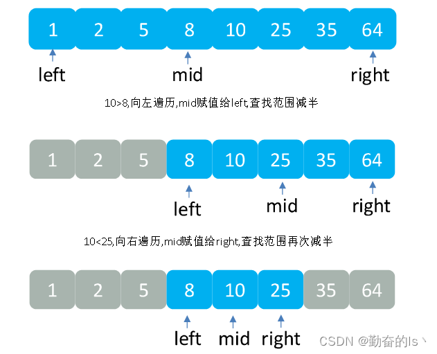 如图所示,我们先将left=1,right=8,mid=4,此时第mid的数为8,我们需要查找的数n为10,10>8,因此去8的右侧进行查找,并在第三轮成功查到。
