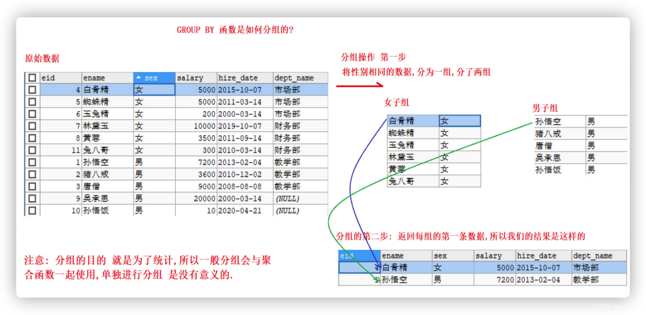 select * from emp group by sex; -- 能查到结果, 但是没有意义