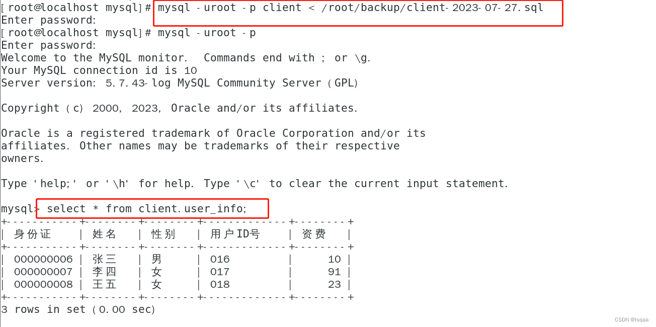 mysql -uroot -p123456 client < /root/backup/client_userinfo-2020-07-30.sql