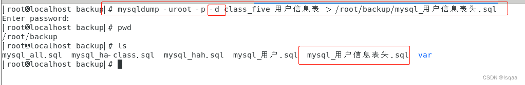mysqldump -u用户名 -p[密码] -d 数据库名 表名 > /备份路径/备份文件名