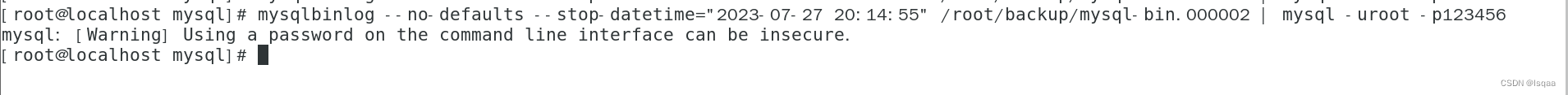 mysqlbinlog --no-defaults --stop-datetime="2023-07-27 20:14:55" /root/backup/mysql-bin.000002 | mysql -uroot -p123456
