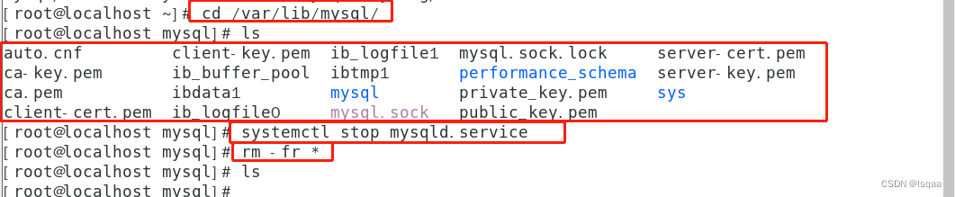 停止服务并进到 cd /var/lib/mysql/ 删除所有文件(因为刚刚启动MySQL,登陆时会自动产生文件)