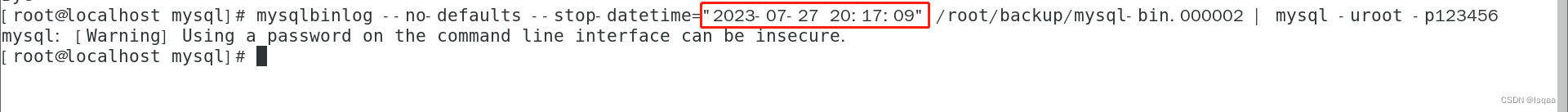 mysqlbinlog --no-defaults --stop-datetime="2023-07-27 20:17:09" /root/backup/mysql-bin.000002 | mysql -uroot -p123456