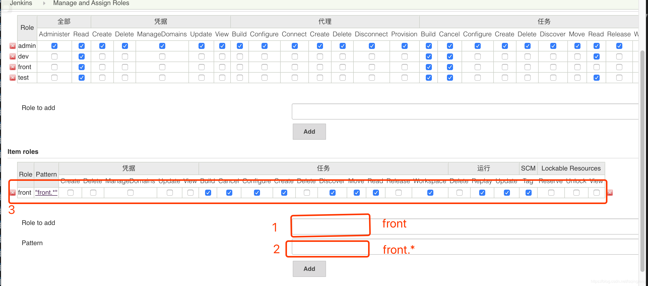 还是按照1,2,3的顺序, 要注意1里的角色名称一定是上一步已经创建好的角色, 第二步要注意*号前面有一个. 不写”点“ 后边可能不管用,这个就代表该角色绑定的是以fron开头的项目。第三步按照图中勾选。