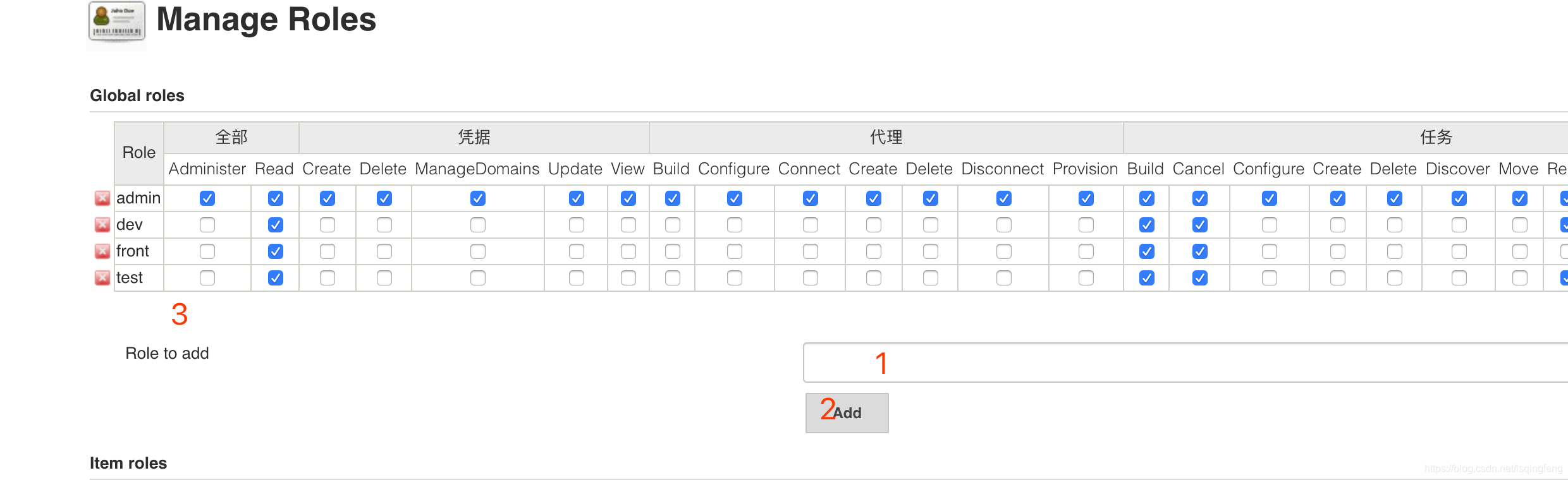 按照图中1,2,3 的顺序操作。 先添加一个角色名称, 然后add后添加成功,会在列表中显示,然后勾选权限