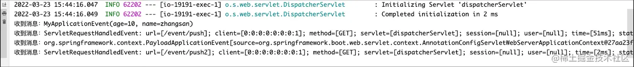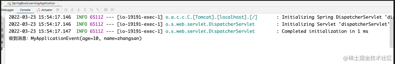 这里加入了@EventListener 注解代表了这是一个监听器。方法名随意,方法里的参数代表监听的事件类型。
