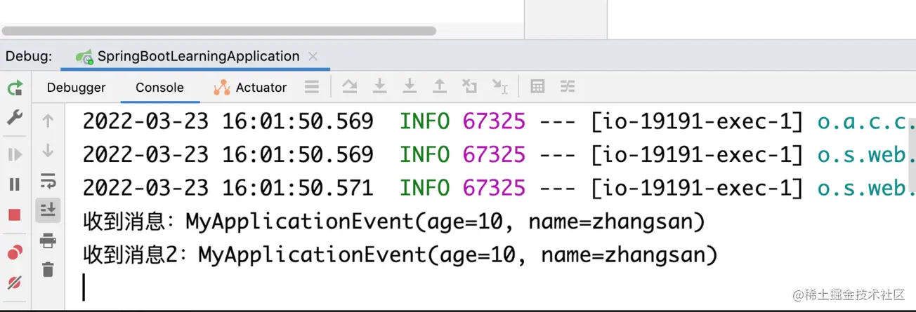 调用推送字符串的时候,我们的监听器不会执行,原因是我们的拦截器里已经加了泛型MyApplicationEvent,也就是只会监听MyApplicationEvent类型的消息。其他类型的消息不会被监听到。
