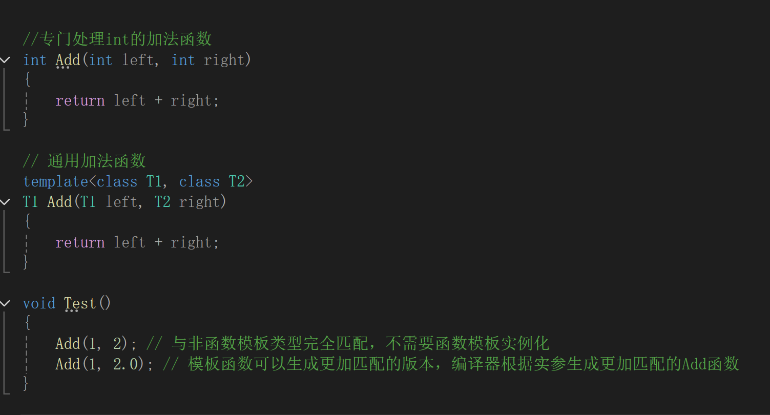 (2). 对于非模板函数和同名函数模板,如果其他条件都相同,在调动时会优先调用非模板函数而