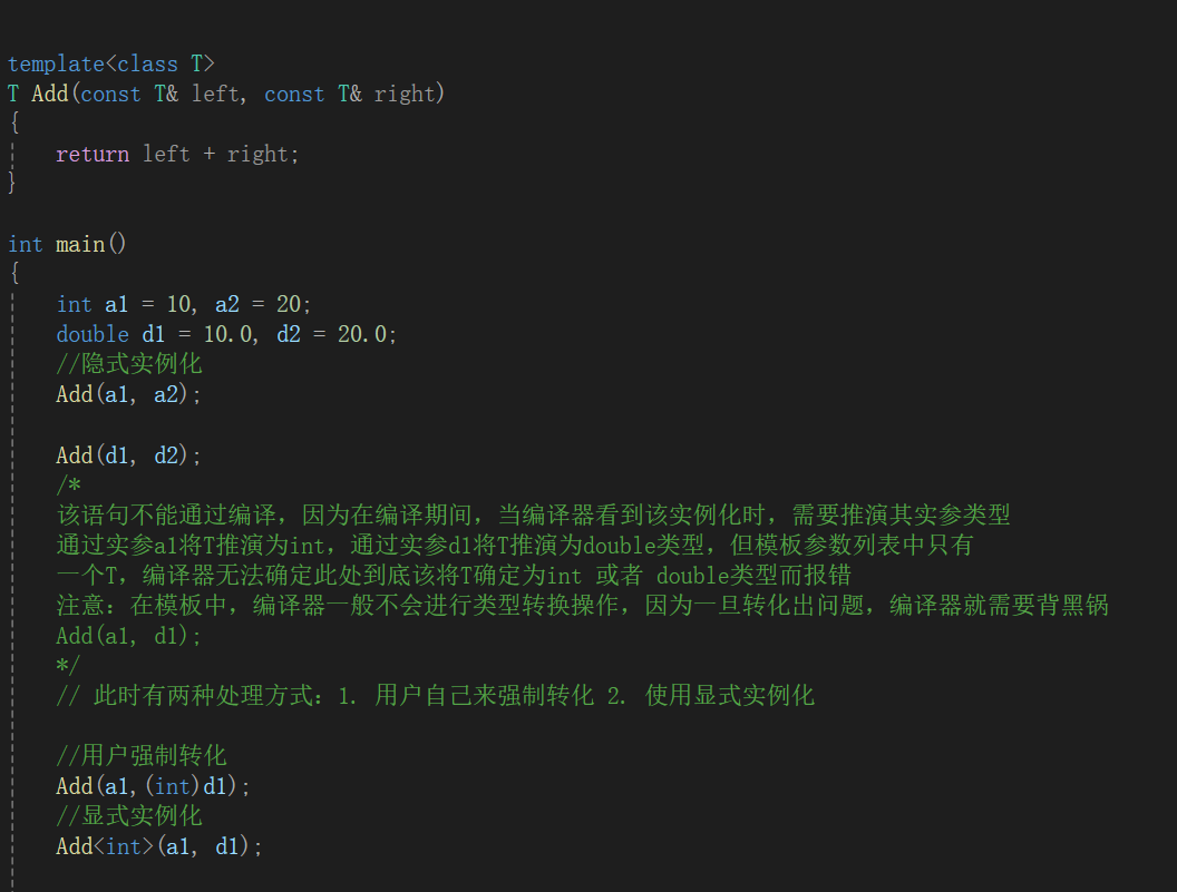 用不同类型的参数使用函数模板时,称为函数模板的实例化。模板参数实例化分为:隐式实例化和显式实例化。