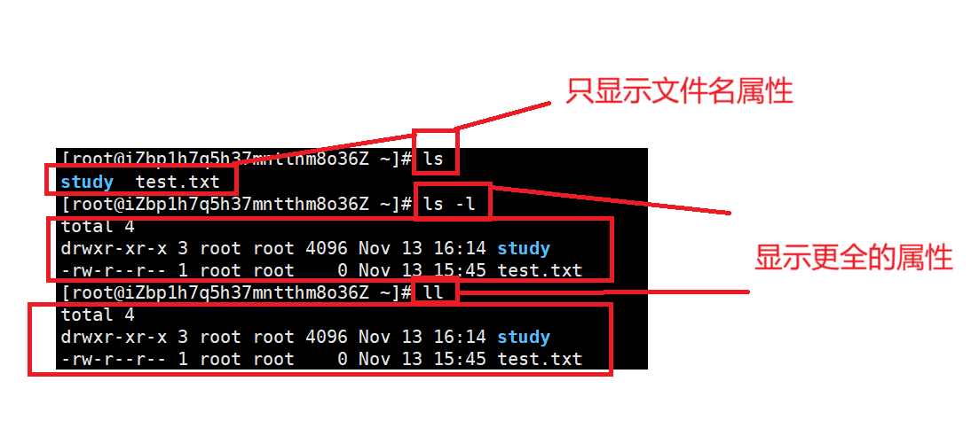 ls -l / ll 显示更全的文件属性(ll是ls -l的别名,用