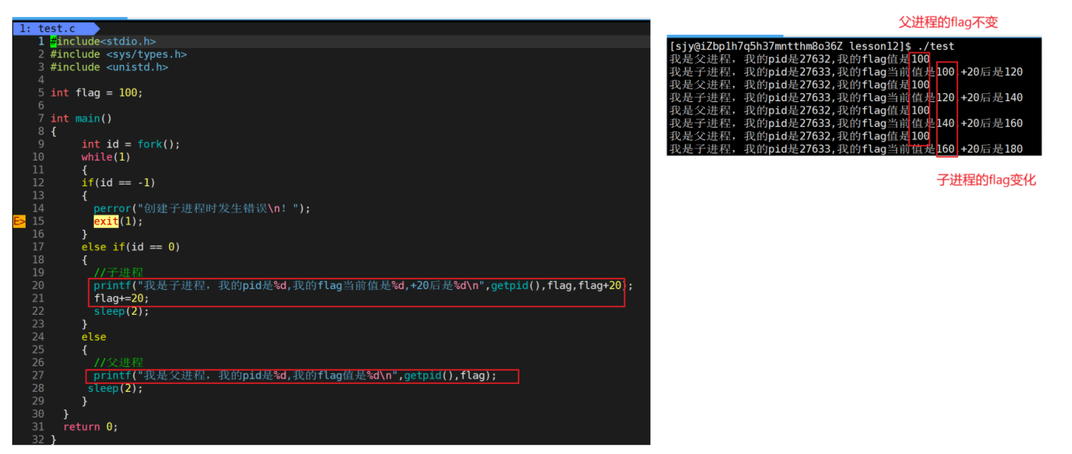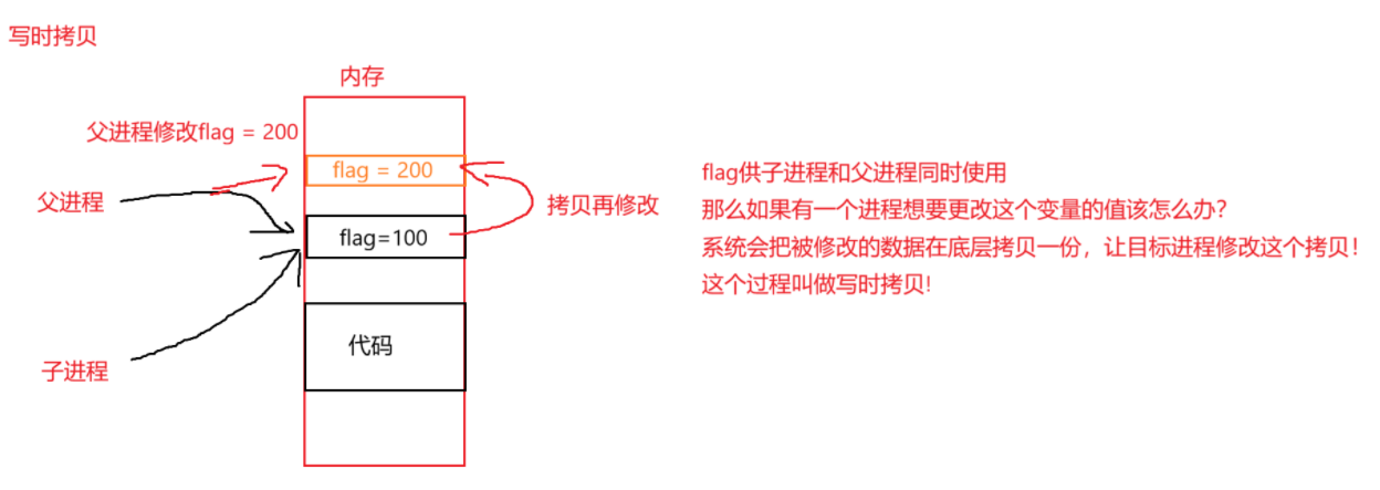 子进程没有自己的代码和数据,因为目前没有程序新加载,所以它会和父进程共同使用一份数据和代码,但是这样就会造成一些问题,代码可以共同使用,但是数据如何共同使用?