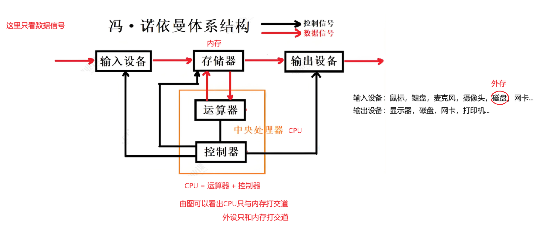 内存是分级的,越快所需费用越高,如果所有设备都是用高级别的存储设备,那么计算机的价格将非常昂贵,,冯-诺伊曼体系结构的设备只需要内存部分使用高级别的存储设备,有数据需要传输计算时,将输入设备的数据拷贝到内存中(系统会提前将一定数据提前拷贝到内存中以保证效率)(因此体系结构的效率由设备的“拷贝”效率决定),由内存跟CPU进行交互,这样一来大大节省了成本,计算速度也非常快,现代计算机是性价比的产物