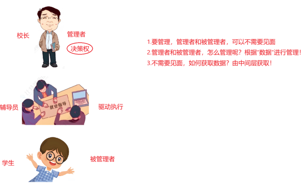 校长是管理者,学生是被管理者,辅导员相当于中间人