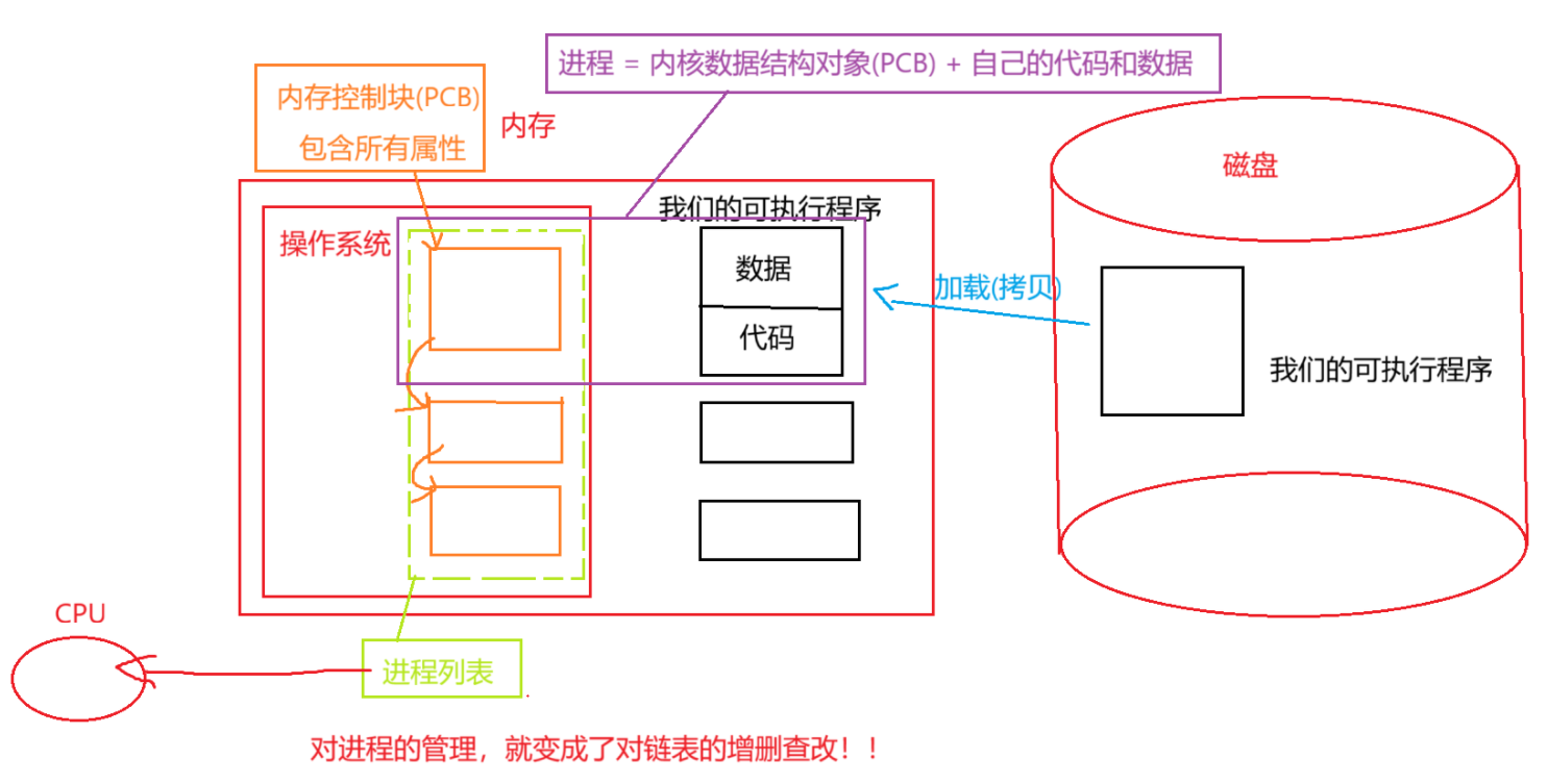 系统会在内核创建一个结构体,用来存储这个程序的相关属性信息,该结构体称作进程控制块,通过它里边的信息可以找到当前程序的一切信息,这也就完成了管理的“描述”动作,随后将进程控制块加入到进程列表中,也就是“组织”,这样系统就可以对该程序进行管理了。