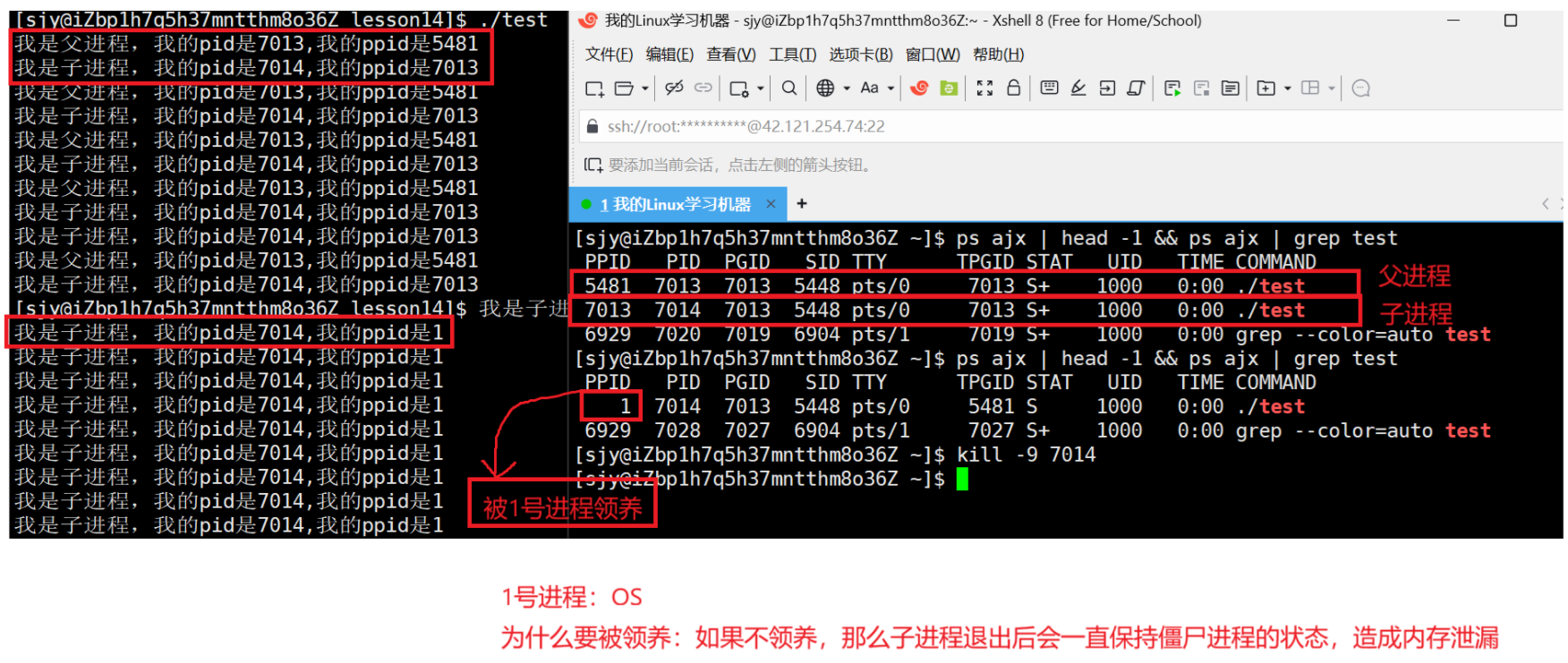 如果父进程先退出,子进程会被1号进程领养,这个被领养的进程叫孤儿进程,变为孤儿进程后该进程会变为后台进程