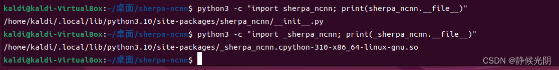 使用命令,导入sherpa-ncnn和_sherpa_ncnn两个包,并显示其所在路径