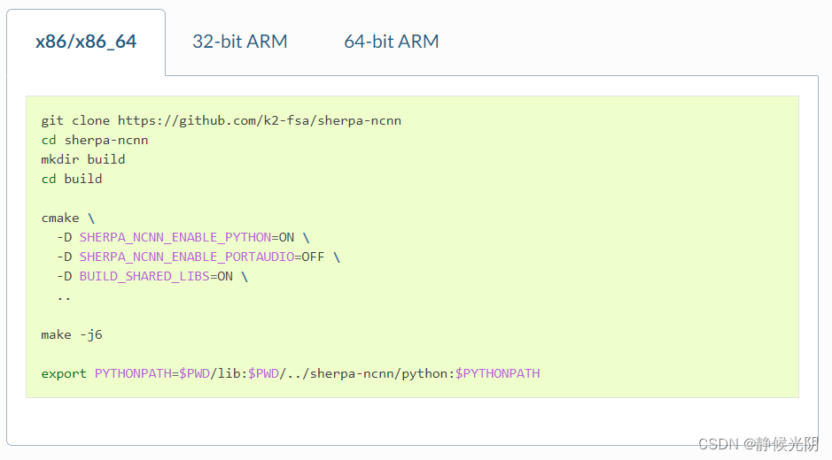 (!!!按照文档写的,使用python的同志直接跳过,看二、使用sherpa-ncnn的python API实现语音识别)
