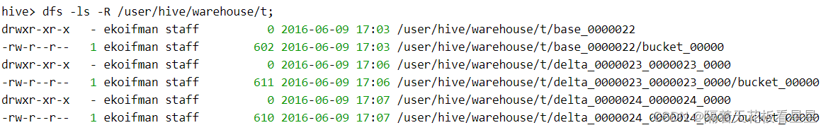 以前,一个分区(如果表未分区,则为表)的所有文件都位于一个目录中。如果有了更改,使用ACID感知编写器编写的任何分区(或表)都将有一个基本文件目录和一个增量文件目录。以下是未分区表“t”的情况: