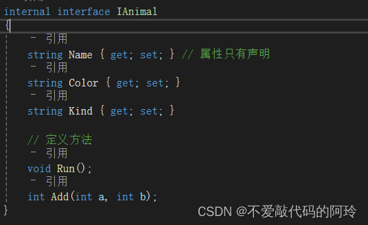 使用interface关键字定义接口 一般以I开头进行命名