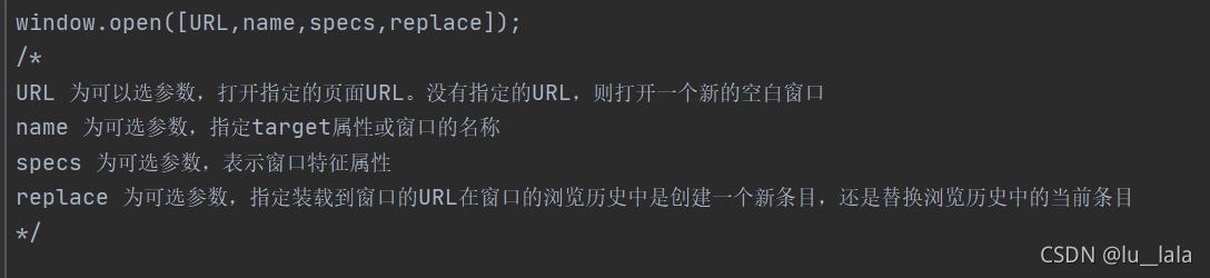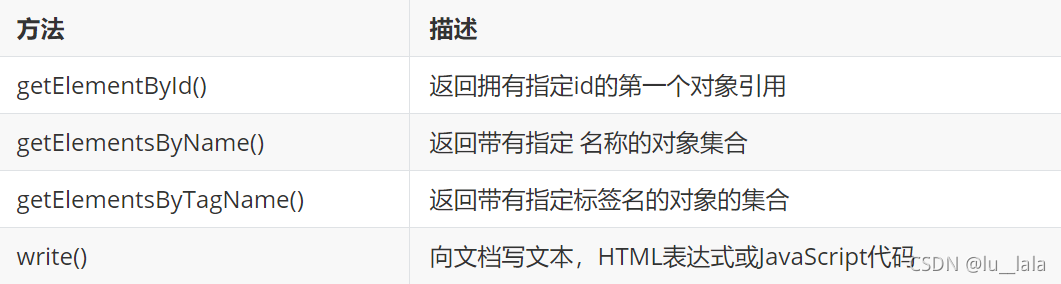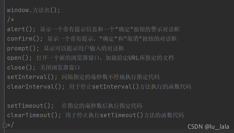 window对象常用方法:alert()、confirm()、prompt()、open()、close()、 setInterval()、clearInterval()、setTimeout() clearTimeout()。