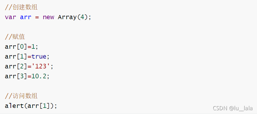 同Java中的数组一样,JavaScript中数组也是具有一个或多个值的集合。数组用一个名称储存一系列的值,用下标区分数组中的每个值,数组下标从0开始。不同的是在JavaScript中一个数组可以存放任意类型值。