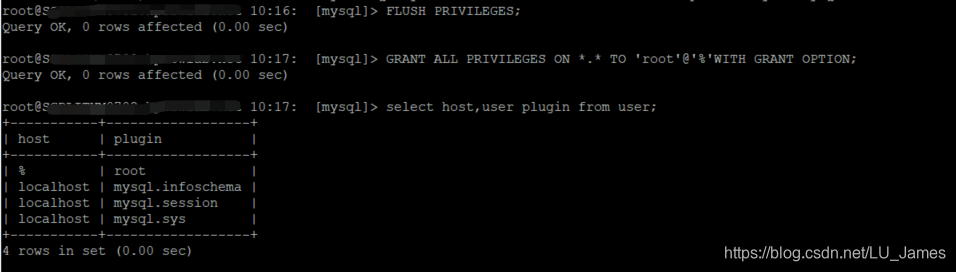 - 赋予权限GRANT ALL PRIVILEGES ON *.* TO 'root'@'%'WITH GRANT OPTION;
