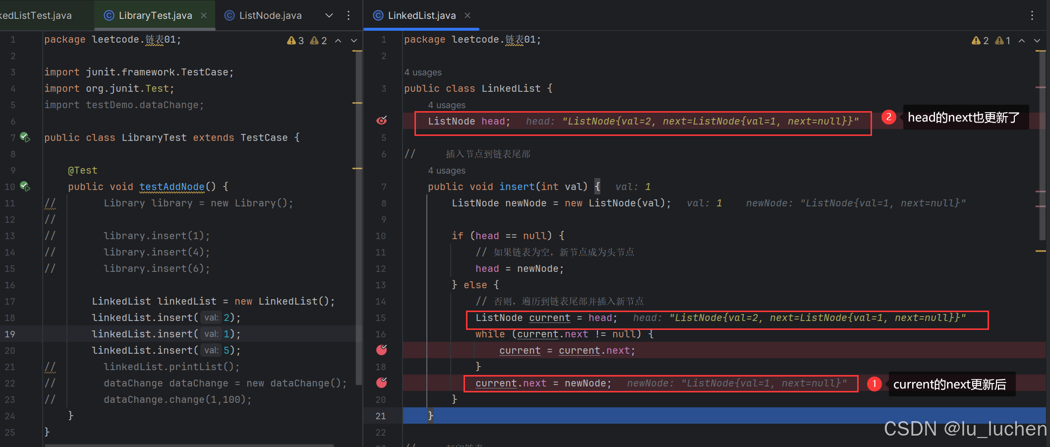 这代表着current和head指向同一对象,current发生改变,head也更新