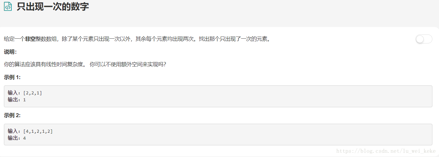 这个题目只是看题目的话是很简单的,但是说明中有一条是应该算法具有线性时间复杂度 ,这一点我是真的百思不得其解。只能先自己实现一下这个功能,但是我的时间复杂度为O(n²)