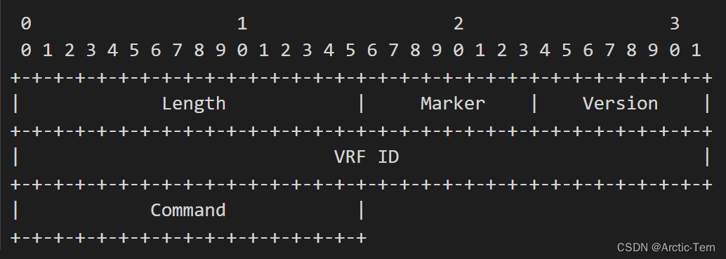 Zebra协议是一个流协议,具有一个通用的标头。版本0缺少版本字段,并且是隐式版本。版本1和所有后续版本都有一个版本字段。通过检查标头的第3个字节,可以将版本0与所有其他版本区分开来,该字节包含除版本0之外的所有版本的255(在Quagga中)或254(在FRR中)标记值。标记字节对应于版本0中的命令字段,标记值是版本0中保留的命令。