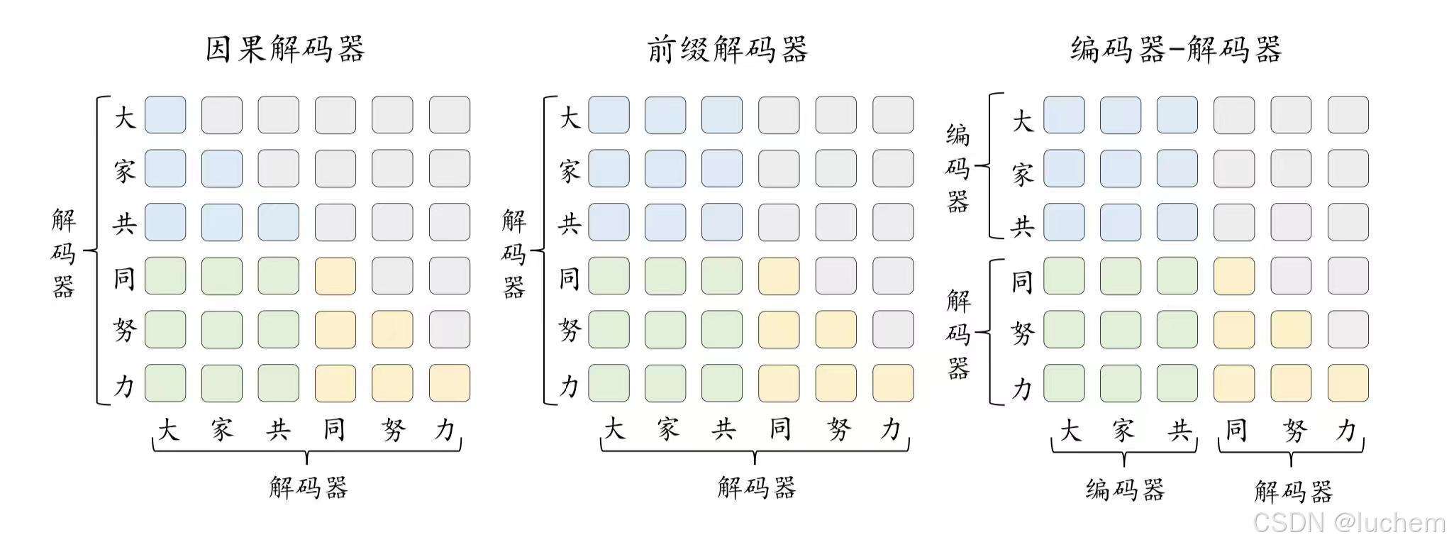 前缀解码器架构也被称为非因果解码器架构,对于因果解码器的掩码机制进行了修改。该架构和因果解码器一样,仅仅使用了解码器组件。与之不同的是,该架构参考了编码器-解码器的设计,对于输入和输出部分进行了特定处理。
