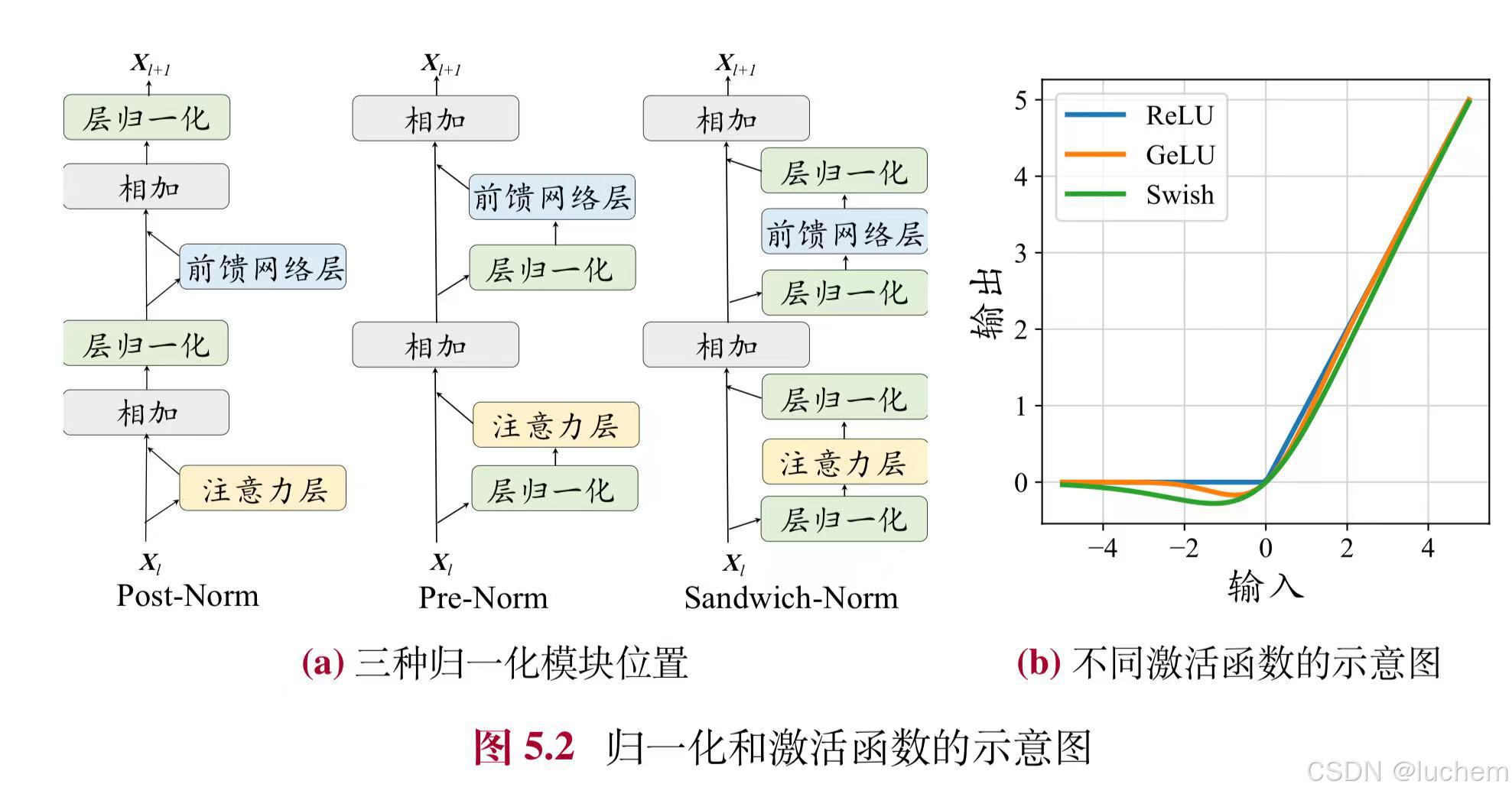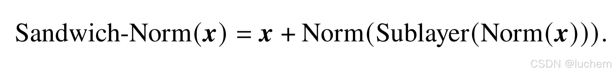 - Sandwich-Norm:在Pre-Norm 的基础上,Sandwich-Norm [165] 在残差连接之前增加了额外的LayerNorm,旨在避免Transformer 层的输出出现数值爆炸的情况。具体的实现方式如下所示:
